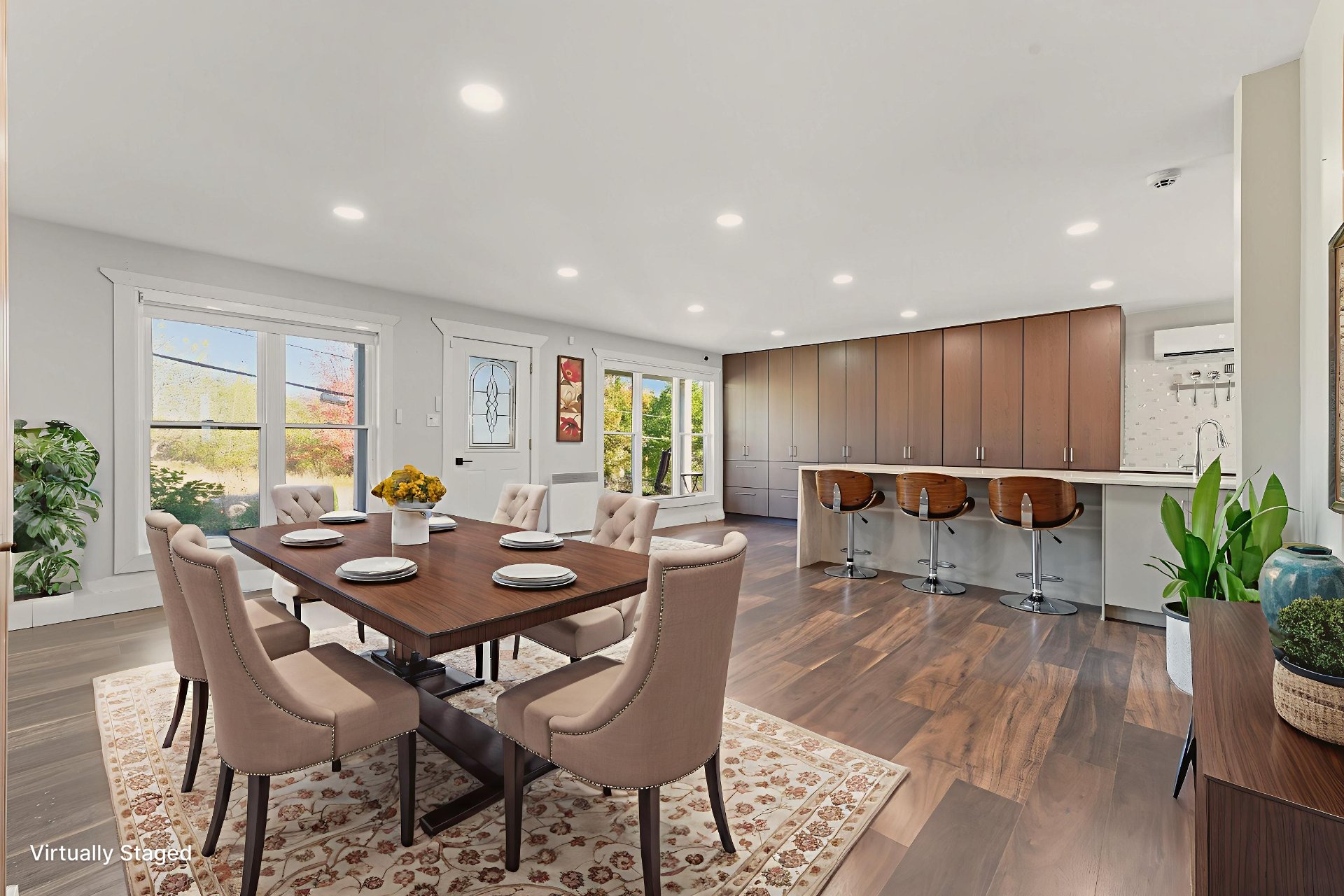 La salle à manger attenante et le salon chaleureux créent