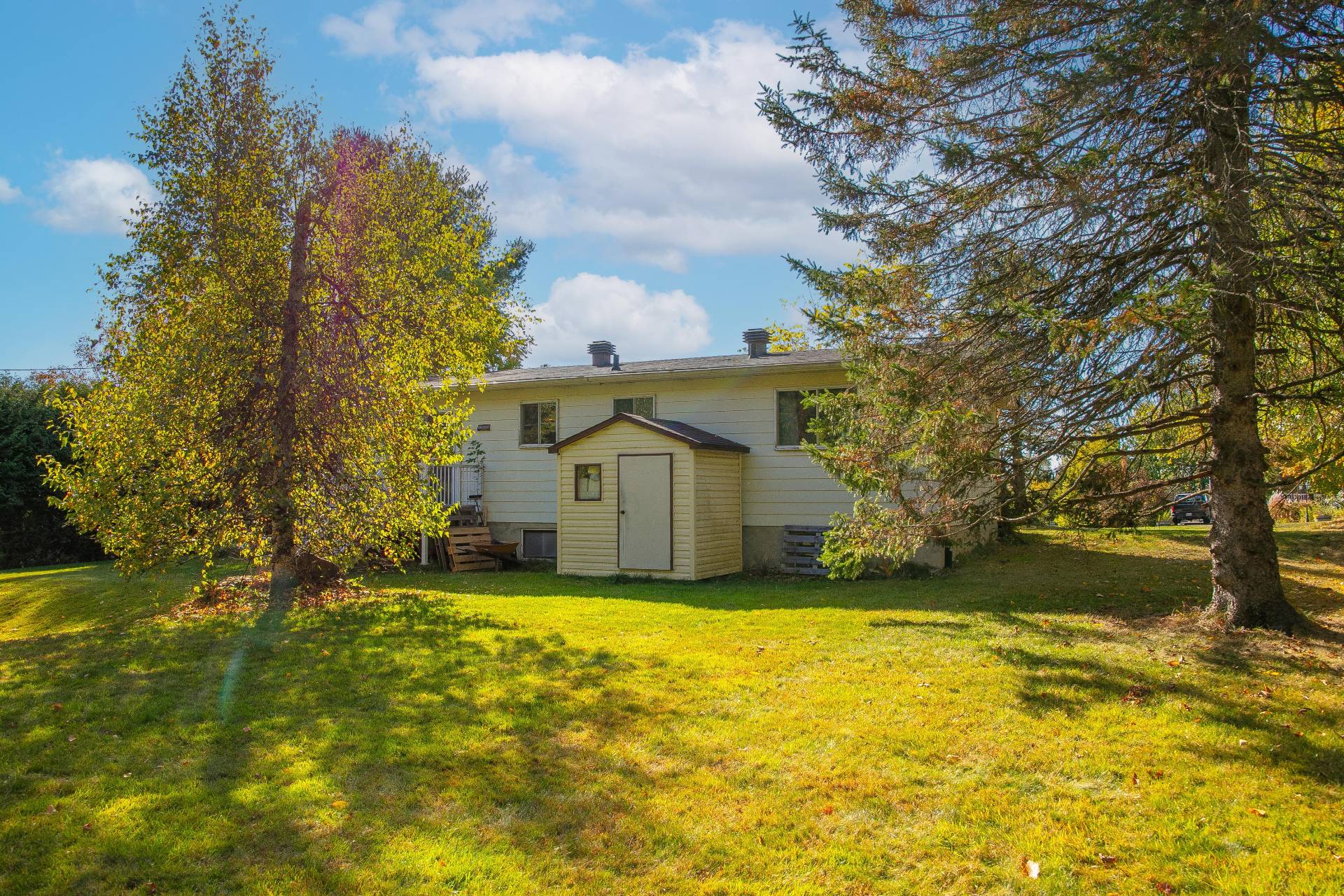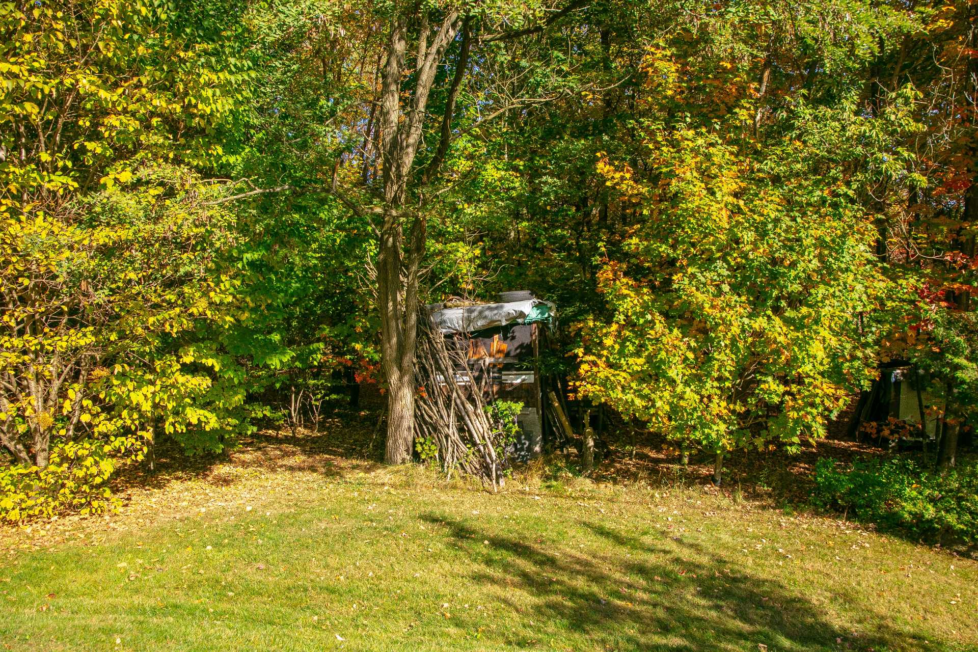 Rideaux, tringles à rideaux, stores, tapis, tondeuse à gazon, barbecue dans le hangar, vélo dans le hangar, échelle, divers appareils de jardin dans les deux hangars